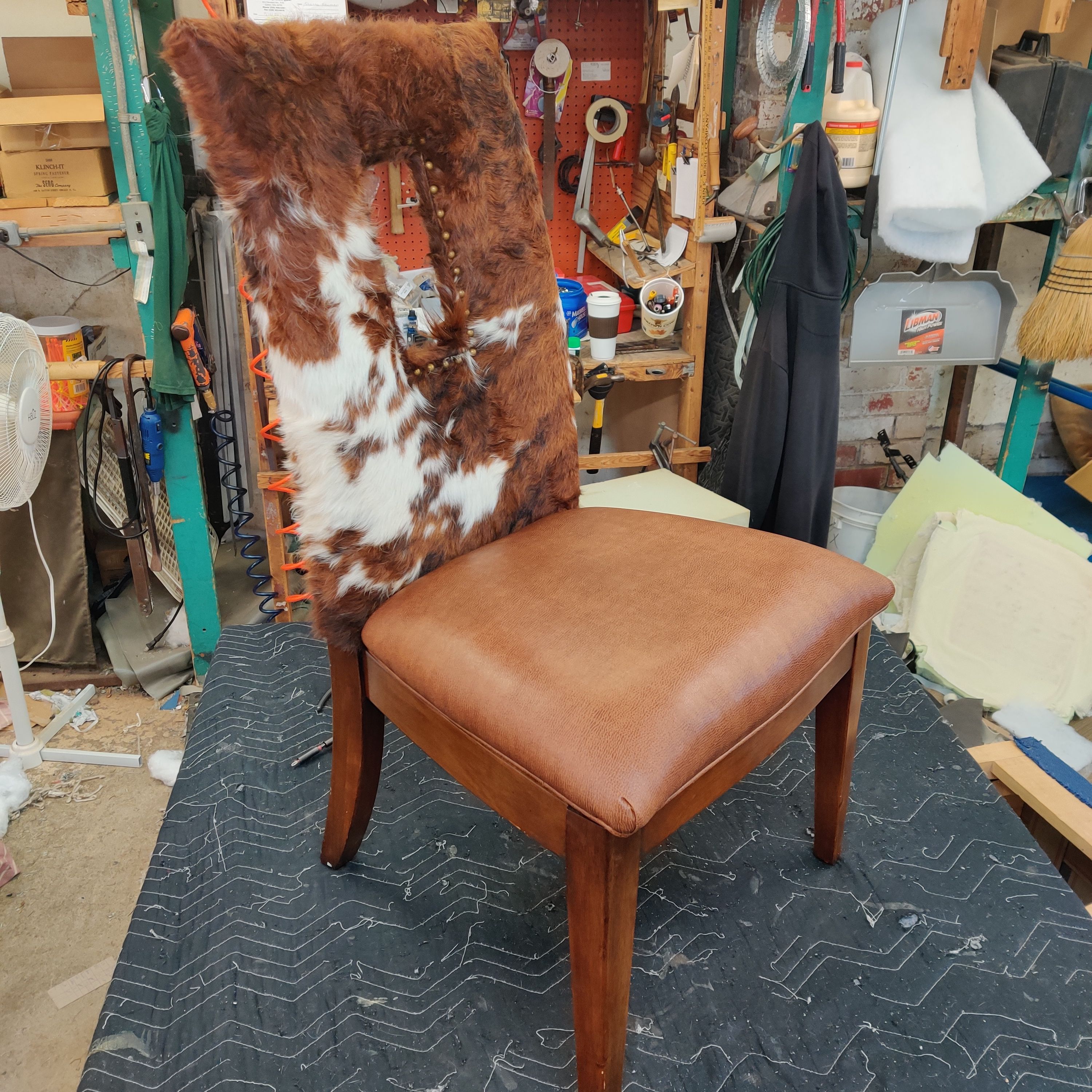 Below: Dining chair redone with cowhide + faux leather with added nails for detailing.